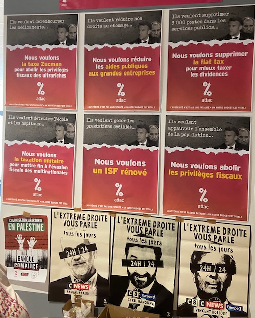Ci-dessous les 6 affiches (juste devant mon stand - bien pratique pour discuter ) du stand ATTAC de l’UEMSS de Bordeaux-Talence