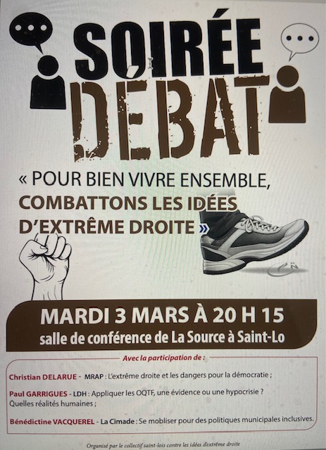 Conférence à St LO de Christian Delarue - Conseil National du MRAP (commission contre ED), président du CADTM France, membre de l’espace démocratie d’ATTAC France, syndicaliste (UFR Finances CGT) antifasciste (au CALED 35 CGT membre de VISA) et à Ripostes antifascistes (au titre du Cadtm).