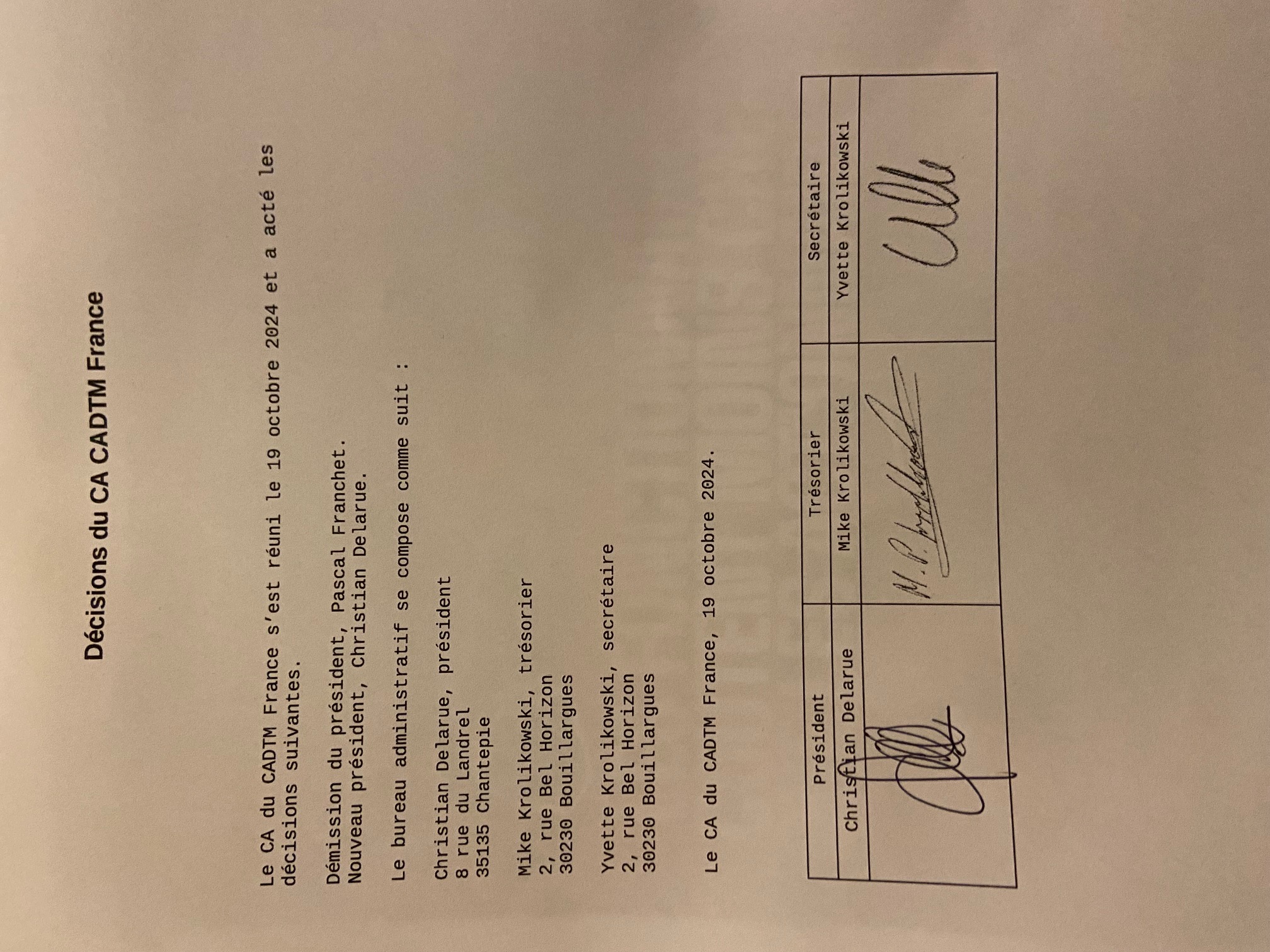 Le 19 octobre 2024 le bureau (BE) élu par le Conseil d’Administration (CA) du CADTM France (Christian D-, Yvette K- et Mike K-) a signé les statuts du CADTM France (ci-joint), Christian DELARUE étant le nouveau Président élu du CADTM France.